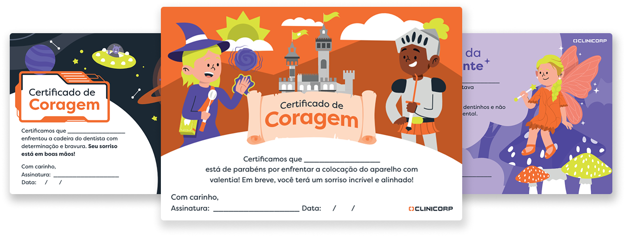 Cada página do material traz ilustrações exclusivas para colorir, além de conteúdos educativos que explicam hábitos e tratamentos de forma lúdica. Para completar, o recurso do Certificado de Coragem — entregue ao final da consulta como reconhecimento pela colaboração — reforça a experiência positiva e memorável. Assim, os pequenos aprendem brincando, enquanto os profissionais têm em mãos uma ferramenta para criar vínculos, facilitar o condicionamento e encantar pacientes e famílias.
