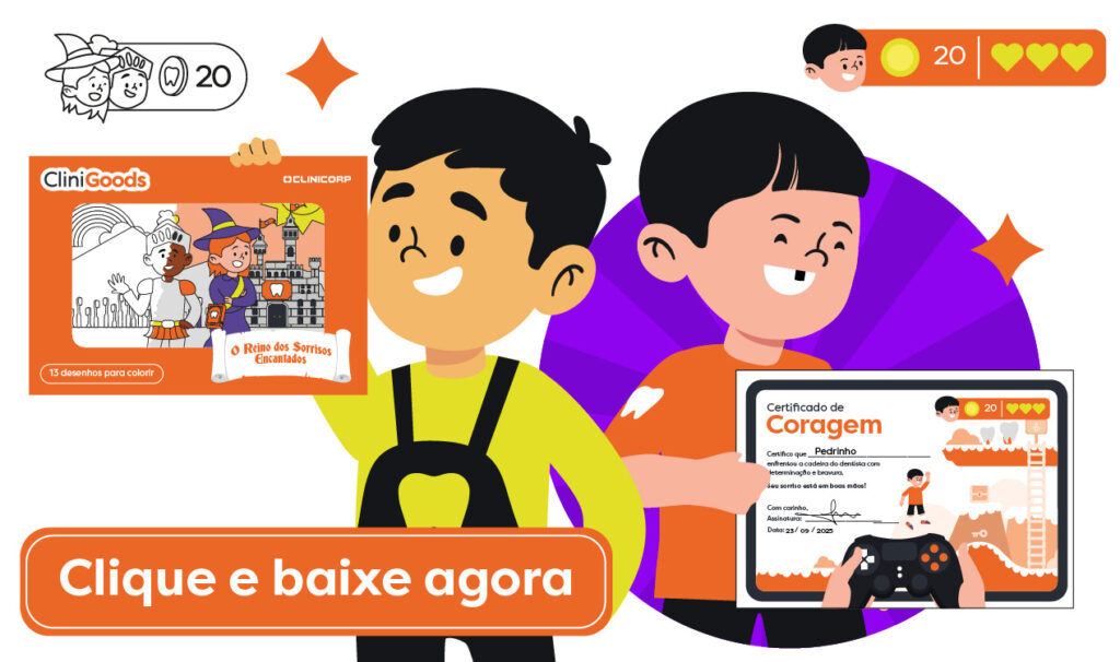 Pensando nisso, em parceria com a Clinicorp, desenvolvemos o CliniGoods, um material gratuito feito com muito cuidado para apoiar os colegas que desejam encantar seus pequenos pacientes por meio do condicionamento infantil na odontologia.